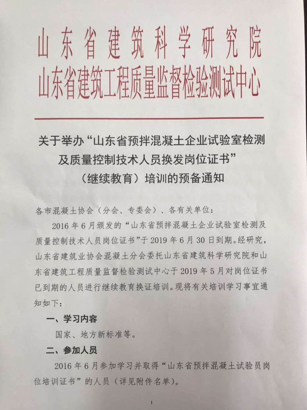 關(guān)于舉辦“山東省預(yù)拌混凝土企業(yè)試驗室檢測及 質(zhì)量控制技術(shù)人員換發(fā)崗位證書” (繼續(xù)教育)培訓(xùn)的預(yù)備通知