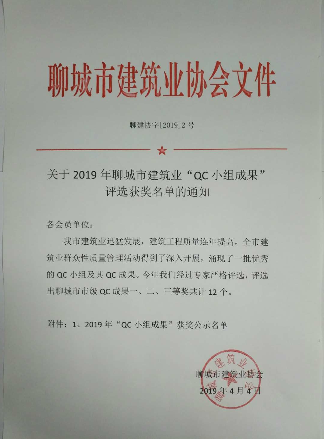 關(guān)于2019年聊城市建筑業(yè)“QC小組成果”評(píng)選獲獎(jiǎng)名單的通知