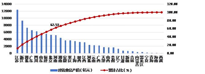 2019 年上半年,江蘇、浙江兩省依然領(lǐng)跑全國(guó)各地區(qū)建筑業(yè),建筑業(yè)總產(chǎn)值分別達(dá)到 12438.98 億元、9291.17億元,兩省共占全國(guó)建筑業(yè)總產(chǎn)值的 21.38%。除江蘇、浙江兩省外,總產(chǎn)值超過(guò) 5000 億元的還有湖北、廣東、四川、山東、福建、北京和河南7 個(gè)地區(qū),上述 9省市完成的建筑業(yè)總產(chǎn)值占全國(guó)建筑業(yè)總產(chǎn)值的 62.53%(圖 1)。