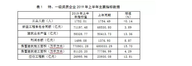 住房和城鄉(xiāng)建設(shè)部匯總的6552個(gè)特、一級(jí)資質(zhì)建筑業(yè)企業(yè)2019年上半年主要指標(biāo)數(shù)據(jù)如下(表1)。