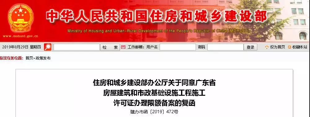 2019年8月16日,住房和城鄉(xiāng)建設(shè)部辦公廳復(fù)函廣東省住建廳,同意其《關(guān)于申請廣東省房屋建筑和市政基礎(chǔ)設(shè)施工程施工許可證辦理限額備案的請示》,并予以備案。